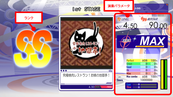 上位から順に、SS, S, A, B, C, D, E の7段階があります。 - 演奏パラメータ領域は、今回の演奏における成績を表示します。