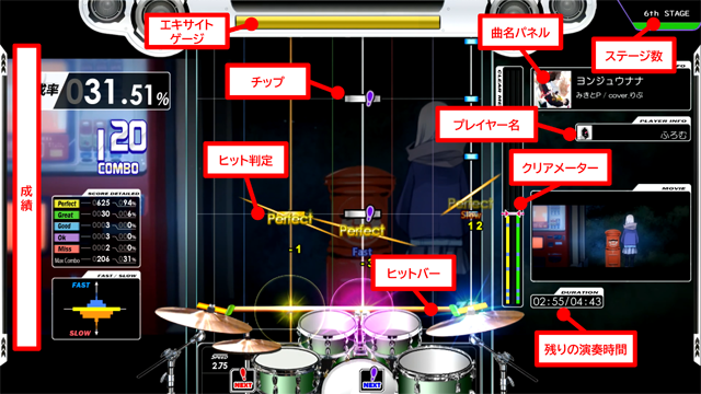 演奏が始まると、画面上部からチップが流れてくるので、ヒットバーに重なるタイミングで、チップに対応するドラムを叩いてください。
