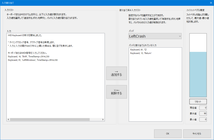 (その下に、現在そのパッドに割り当てられている入力のリストが表示されます。) - パッドに割り当てたい入力情報行をマウスでクリックして追加するボタンを押すと、パッドに割り当てられます。